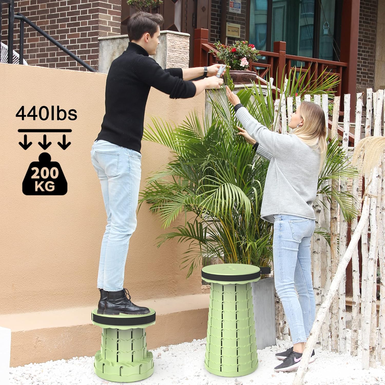 TWO Portable Telescoping Stool Folding StoolSpecifications:Stool Dimensions: 9.84"(25cm) diameter. Weight: 1kg(2.2lbs) /pcs. Strap length: 22 inch(56cm). Max stretched height: 17.72 inch (45cm). Max bearing capacity: 249kg/440Ibs. Colors: Black+GreenPackage Included:2x swivel cushion,2x carebiner ,2x Carry bag,2x camping stool, 2x operation instruction.