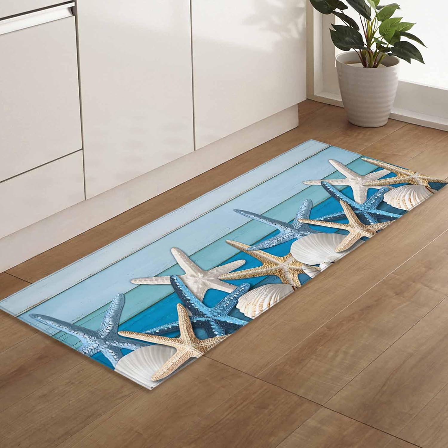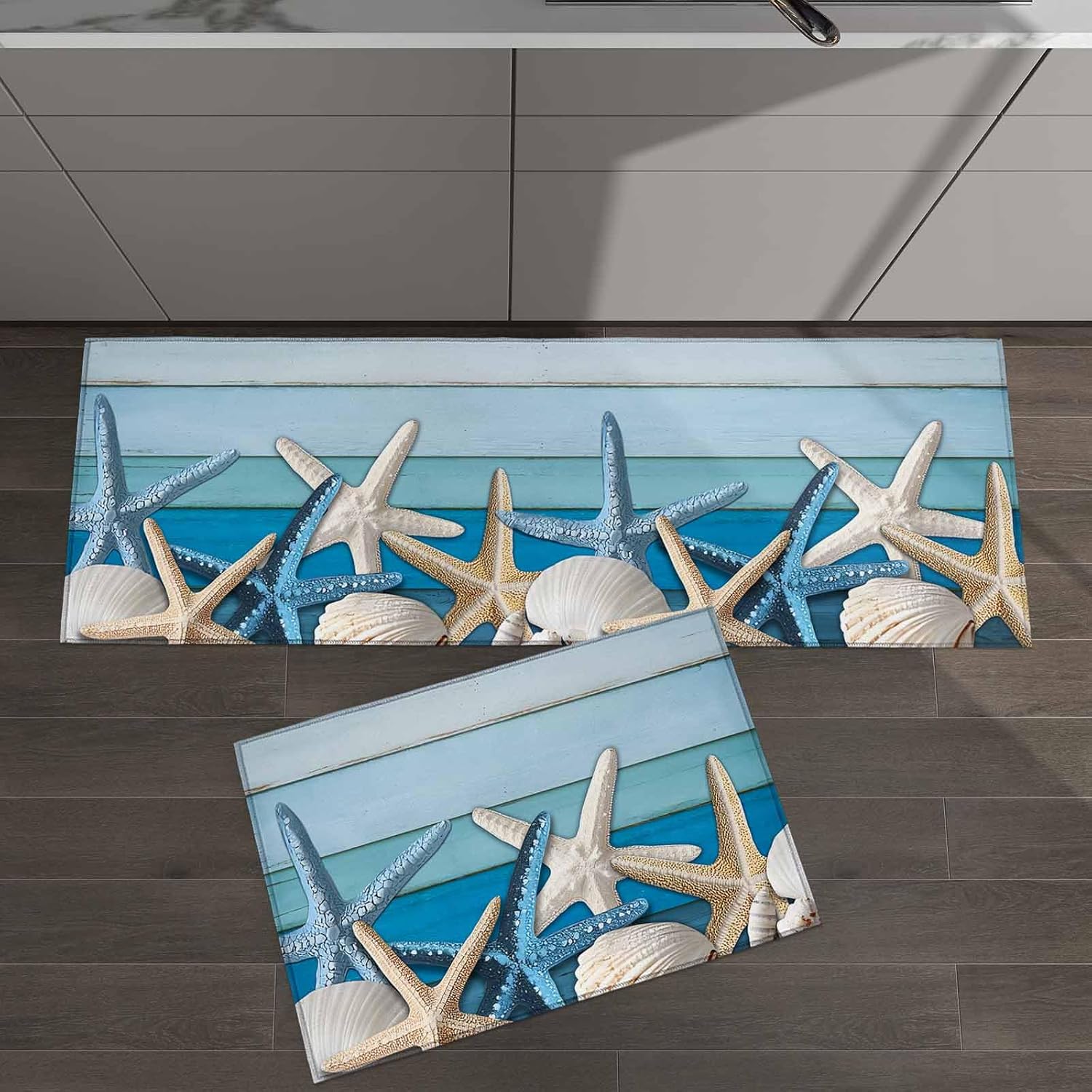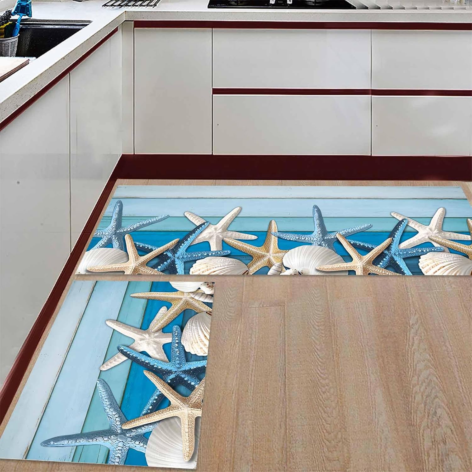 2 Pieces Kitchen Rugs and Mats,Summer Ocean Starfish Shell Area Runner Rug Set Non Slip Floor Doormat Washable Carpet Standing Mat for Kitchen Sink Indoor Corridor,Farmhouse Blue Gradient Wood Plank