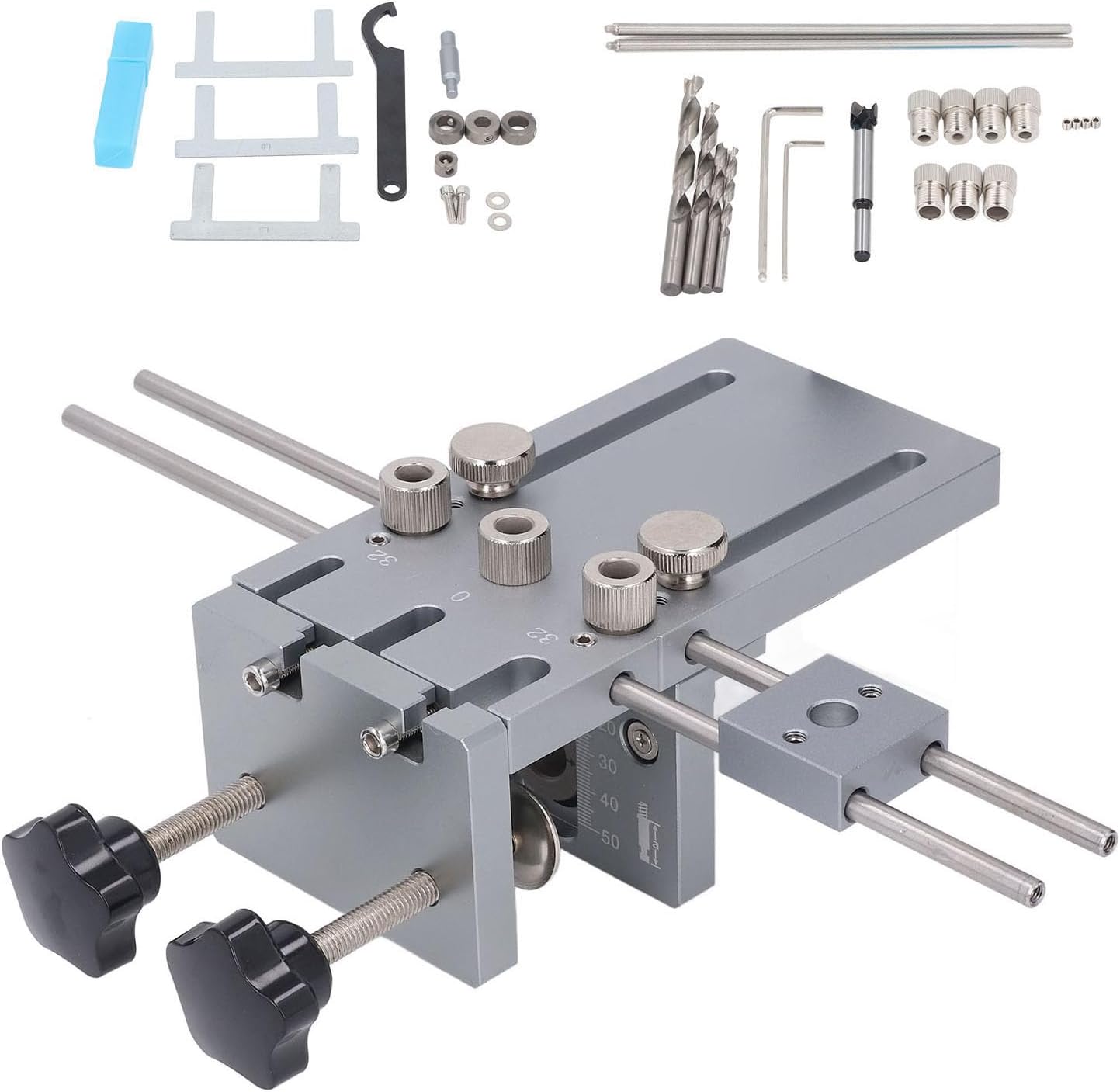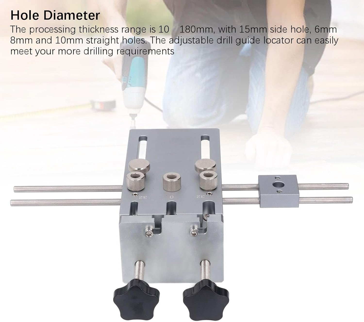 Spec: Item Type: Hole Punch Locator Material: 6061 Aluminum Alloy Processing Thickness: Approx. 10-180mm / 0.4-7.1in Side Hole Diameter: Approx. 15mm / 0.6in Straight Hole Diameter: Approx. 6mm / 0.24in, 8mm / 0.31in, 10mm / 0.39in Slider Stroke: Approx. 5-90mm / 0.2-3.5in Side Hole Stroke: Approx. 23-43mm / 0.9-1.7in Usage Range: Round Wood Dowel Hole Punch Locating How to Use: Directly install and use PackageList: 1 x Quick Release Clamp 1 x Main Board (Including 3Pcs 8mm Drill Bushings) 1 x Clamp Plate 4 x Extension Rods 1 x Slider Assembly 3 x Iron Washers 4 x Drill Bits 3 x 10mm Drill Bushings 3 x 6mm Drill Bushings 1 x 5mm Drill Bushings 1 x Hook Wrench 2 x Hex Wrenches 2 Packs Accessories 1 x Storage Box 1 x User Manual