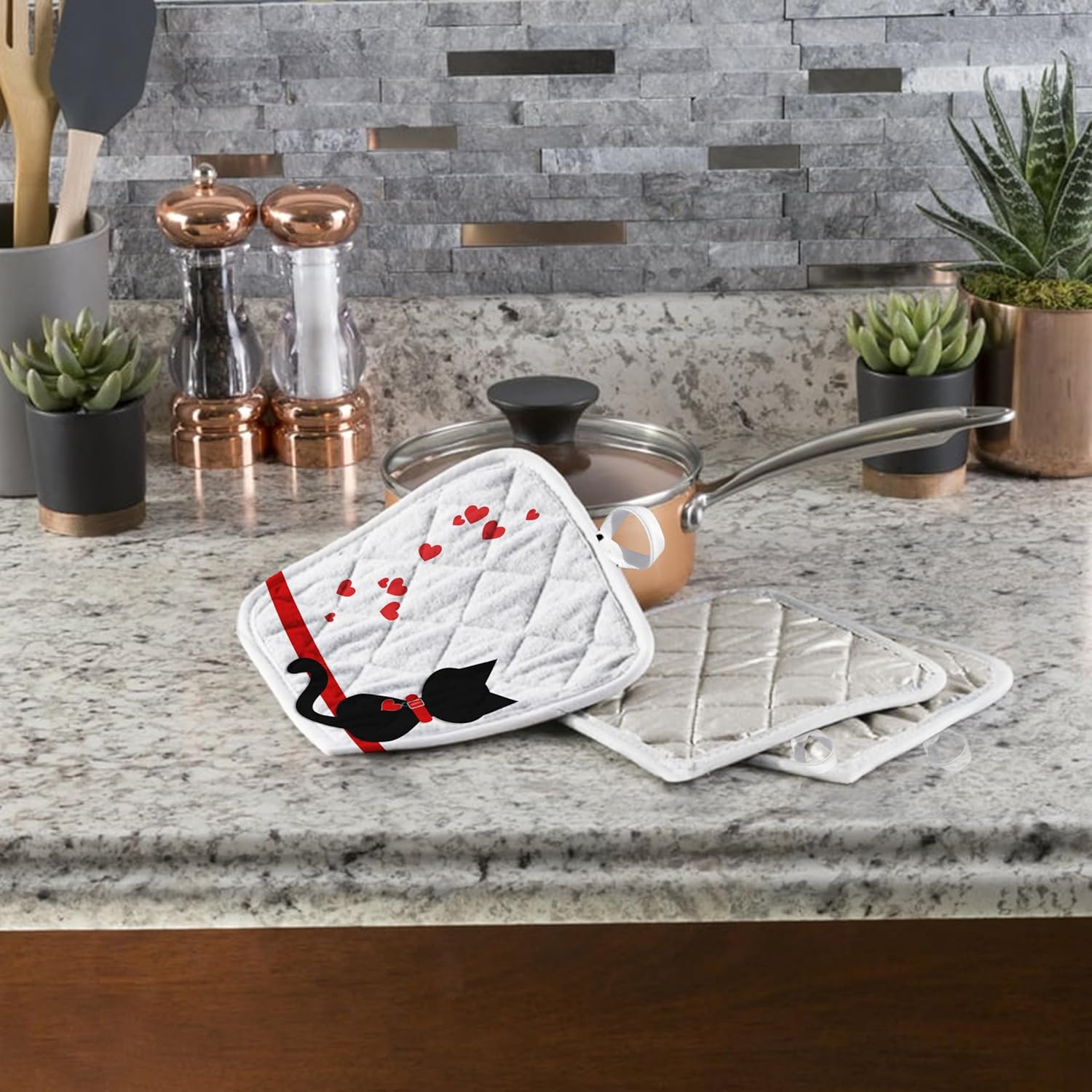 This product is of cotton/polyester blend, pot holder features a quilted design which allows for more flexibility when using. Handy attached loop offers the option to hang for display or storage. Heat resistant for safely removing dishes from the oven and hot pots from the stove. Great as a hostess or housewarming gift.