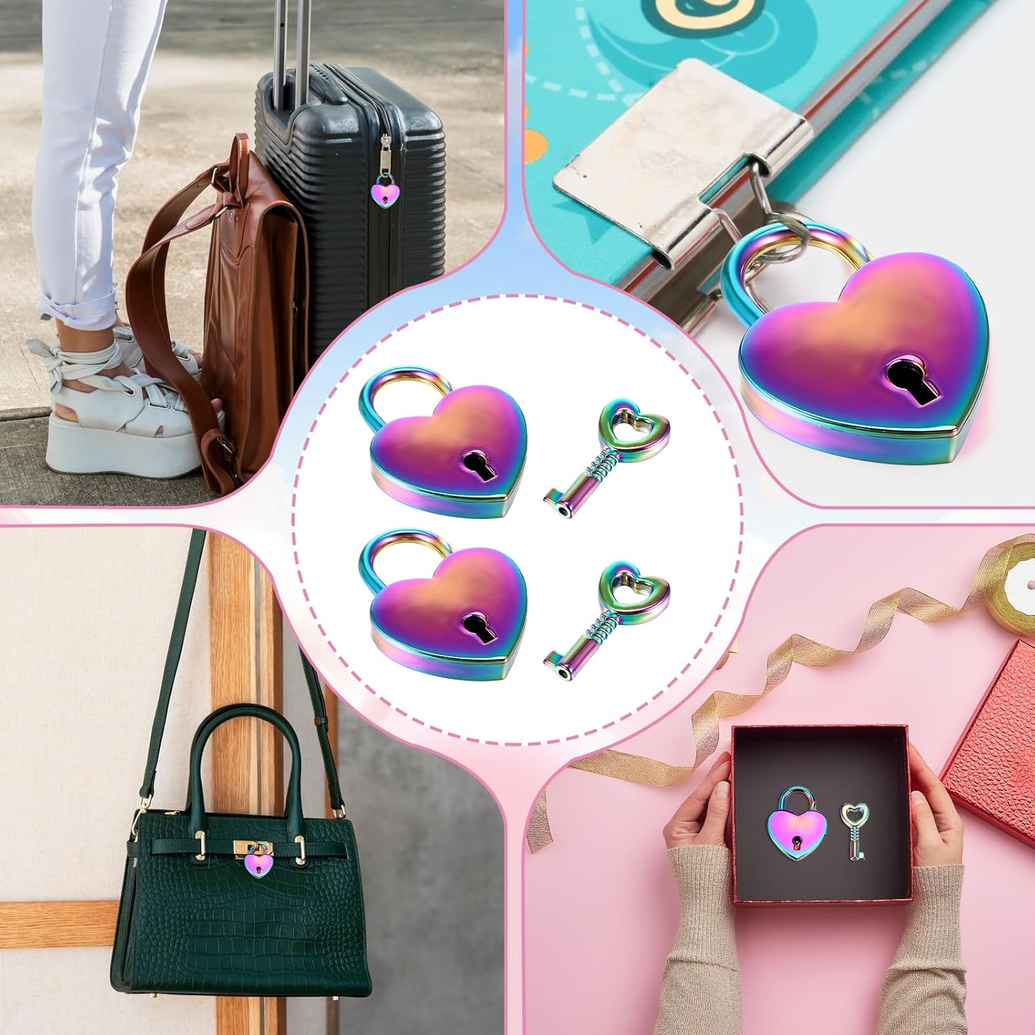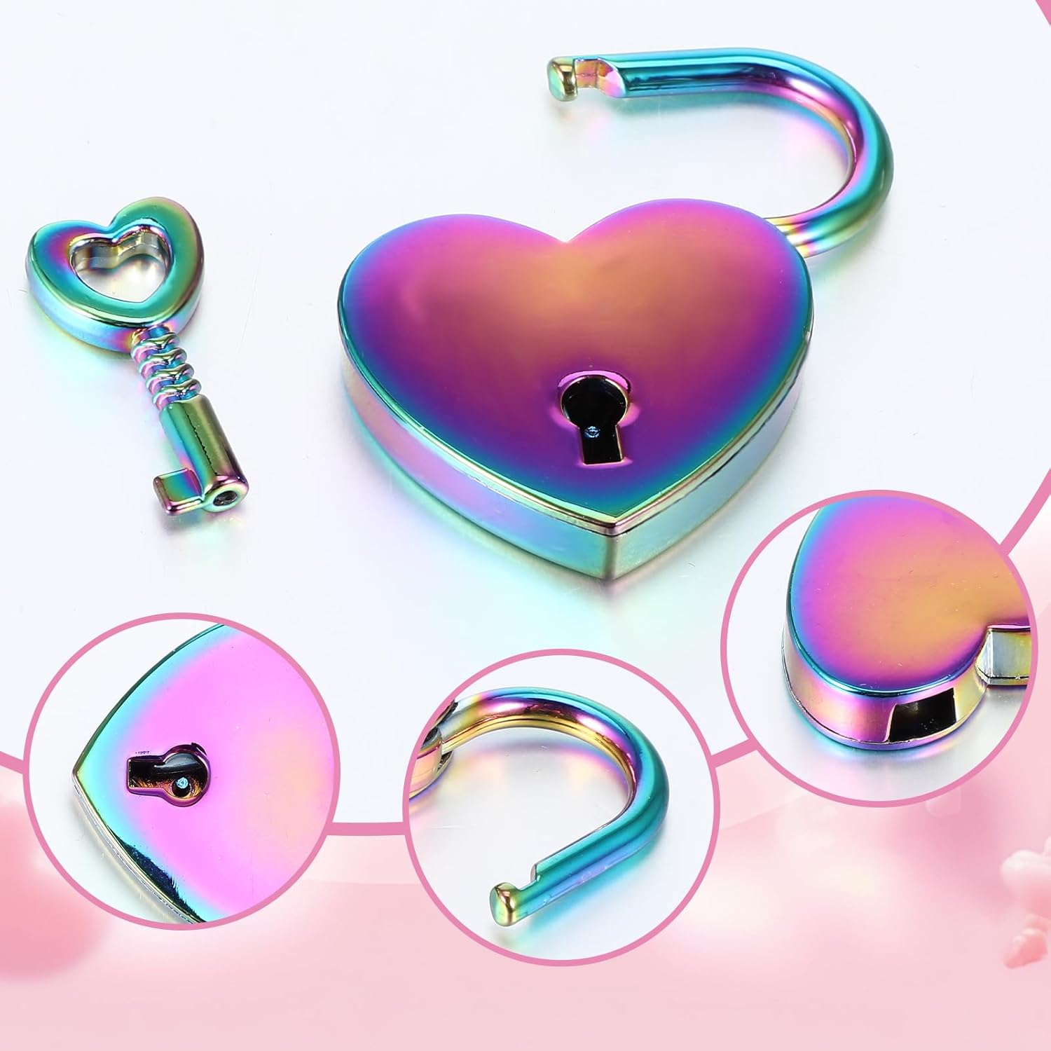 The padlock is very small and lightweight, easy to carry and store, and very suitable for travel use.The heart lock is not just a decoration, but also a unique witness and solid guardian of your love story. This is the best interpretation of your deep commitment to each other, and it is also a beautiful memory to be treasured forever.Color: ColoredMaterial: Zinc alloyItem Dimension: The small heart locks: 3.85 x 3 x 0.7 cm/1.52 x 1.18 x 0.28 inches, the keys: 2.33 x 1.1 cm/0.92 x 0.43 inchesItem Weight: 54.5 gPackage Component: 3 pack colored heart locks with keys.