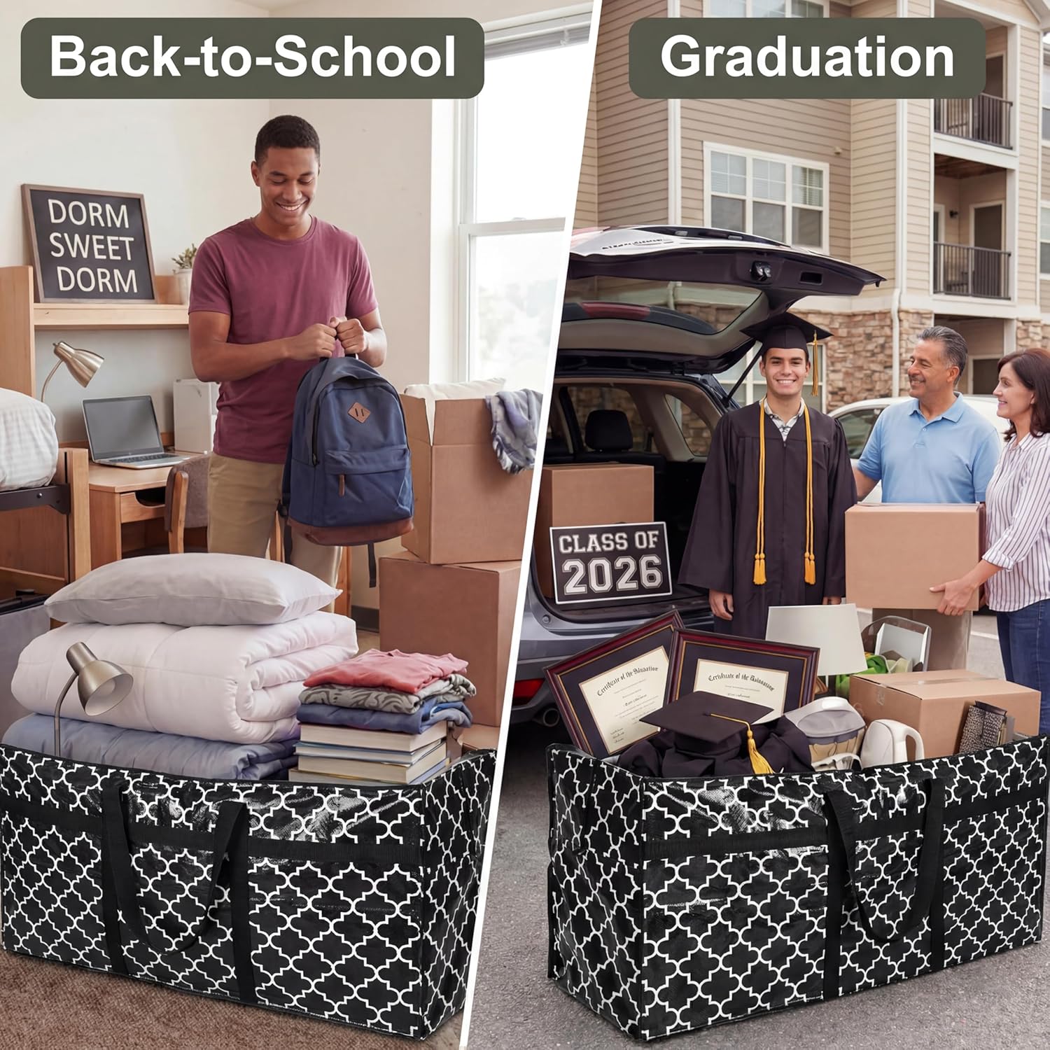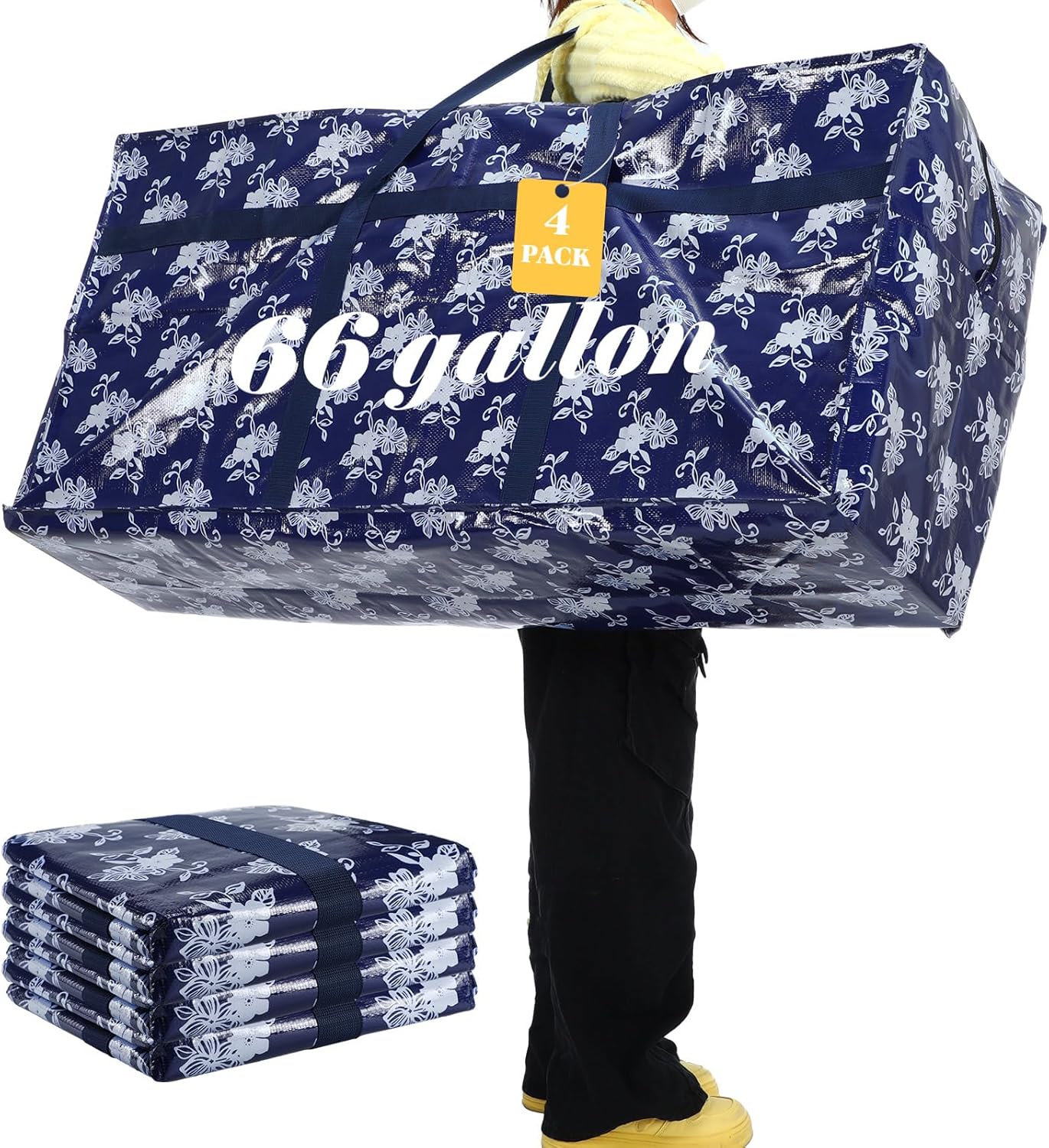 Features: The zipper design of the storage containers for clothes allow for smooth and effortless opening and closing. Available in a beautiful shade of printed pattern, the bag can enhance your home organization system with a touch of vibrant color. When not in use, these bags for moving can be folded for convenience, taking up less space. Intelligently designed, these foldable storage bags are easy to carry, and can be stored until the next time they are needed. Specifications: Material: PE Color: black and white Size: about 45 x 22 x 16 inches/ 115 x 55 x 40 cm Capacity: about 66 gallon/ 250 l Package includes: 4 x Large storage bags Notes: Manual measurement, please allow slight errors on size. The color may exist a slight difference due to different screen displays.