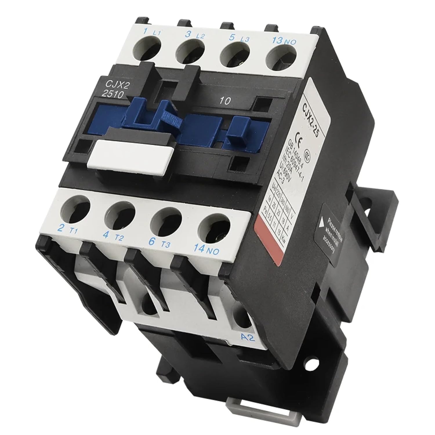 The CJX2-2510 AC Contactor is a robust electrical control component designed for reliable power switching in industrial and commercial applications. Operating at 220-230V 50/60Hz, this 25-amp contactor features a space-efficient din rail mounting system for straightforward installation in electrical panels and control cabinets. The device comes with a 1NO (normally open) contact configuration, making it ideal for controlling motor starters, lighting systems, and other power circuits. Its versatile coil voltage compatibility spans multiple options including 24V, 36V, 110V, 220V, and 380V, providing flexibility across different system requirements. The contactor's durable construction ensures consistent performance and dependable operation under demanding conditions. With its black industrial-grade housing and clearly marked terminals (L1, L2, L3, T1, T2, T3), this contactor offers hassle-free wiring and maintenance. The compact design maximizes panel space while maintaining the robust current handling capacity needed for industrial applications.