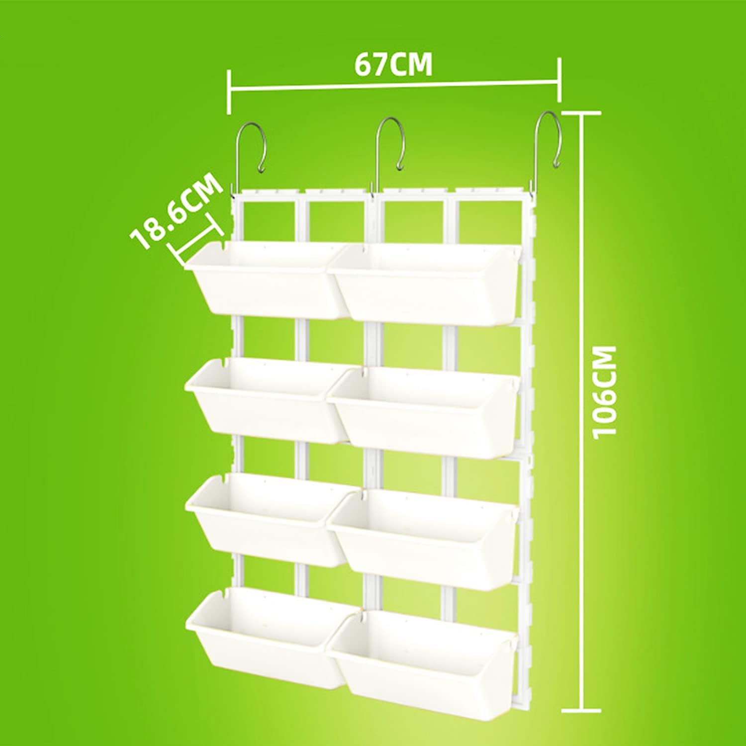 Soil Never Leaks: The vertical garden pots hold the soil properly and never leak.Plastic material: good moisture retention, drainage and breathability. Durable, excess water will automatically drain through the porous material. Lightweight design for easy moving and hanging. Easily hang anywhere. Fixing: The vertical garden pots can be easily fixed to the fence with zip ties and mounted to the wall using nails with larger heads. Or if you are mounting to the wall with screws, you should use washers to keep the screw heads from slipping out of the grommets.Each garden bed container of the vertical garden bed provides adequate space. You can grow a variety of plants. Specification:Product Name: Vertical Garden BedMaterial: Environmental PPColor: White, Light Green, Army GreenWeight: about 6KG Dimensions (LxWxH): 106*67*18.6cmFeatures: New PP material; flower pot stack design, easy installation of retaining wall, simple drip irrigation, labor saving; large capacity water storage, flood drainage and ventilation.Package:1*Planter Raised Beds Kit