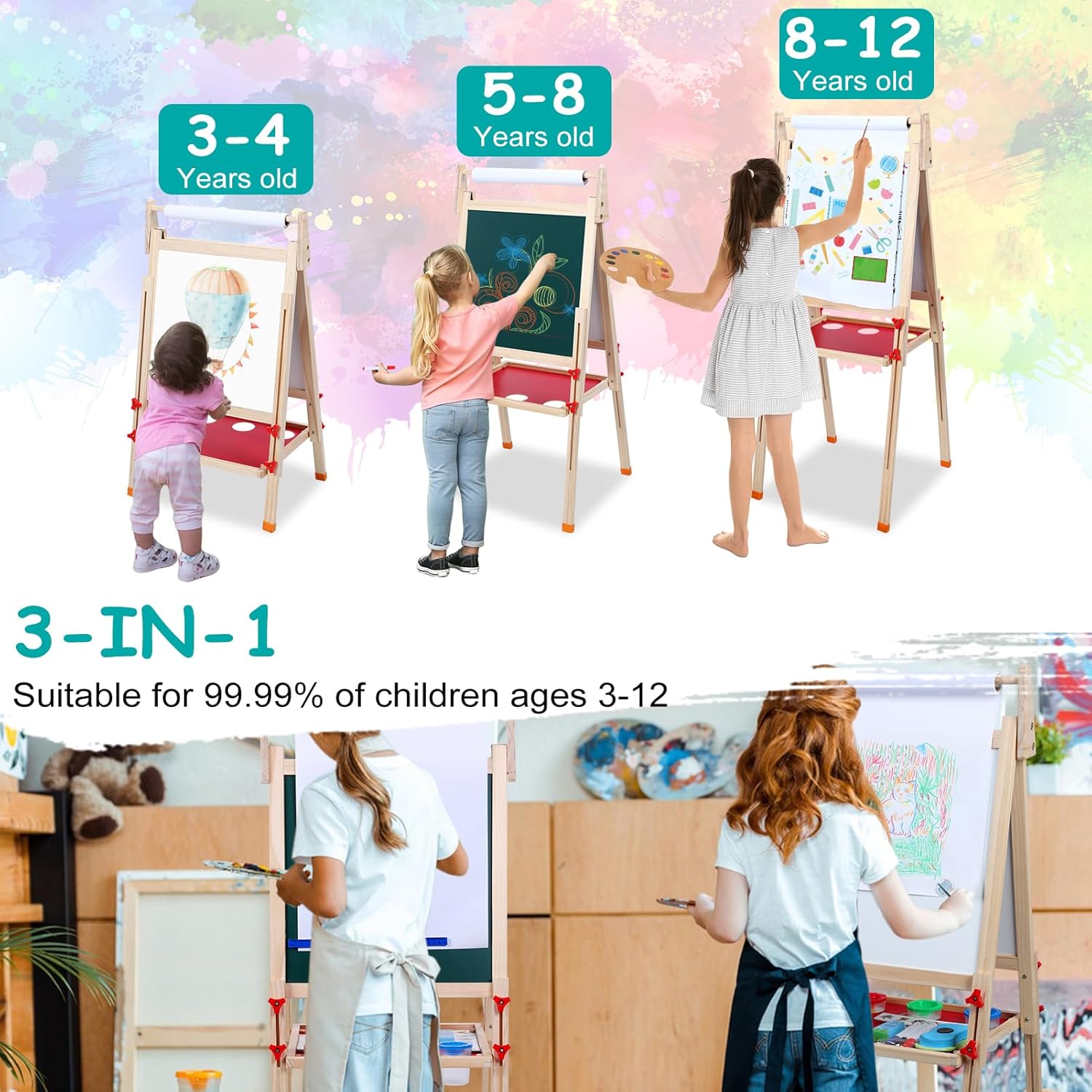 Description:Transform your child's creative journey with this versatile LEAQU height-adjustable art easel.Perfect for ages 3-12, this double-sided wooden easel features a whiteboard on one side and chalkboard on the other, complete with paper clip holders for endless artistic possibilities. The smart design allows height adjustment from 31.5 to 43.3 inches, growing alongside your child from preschool through elementary years.The sturdy wooden construction provides a stable platform for drawing, painting, and learning activities. Includes convenient red storage trays for art supplies and features replaceable paper rolls for extended creative sessions.The easel's practical dimensions (18.9 x 18.1 x 43.3 inches) make it suitable for both home and classroom use, while the drawing board measures 15.37 x 15.37 inches - perfect for young artists. The thoughtful design includes storage cups for organizing supplies and simple adjustment mechanisms for hassle-free height changes.Whether it's for art projects, learning activities, or creative play, this easel stands ready to inspire young minds.Item Name: Drawing BoardMaterial: WoodenSuitable Age: for 2-12 Years OldFeatures: Height Adjustable, Red Tray, Double SidedSize Details:Size: L: 48cm/18.9", W: 46cm/18.11", H: 110cm/43.31" (Approx.)Drawing Board: 39cm x 39cm/15.37" x 15.37" (Approx.)Adjustable Height: 80cm-110cm/31.52"-43.34" (Approx.)Package Includes:1 x Drawing Board1 Set of Accessories
