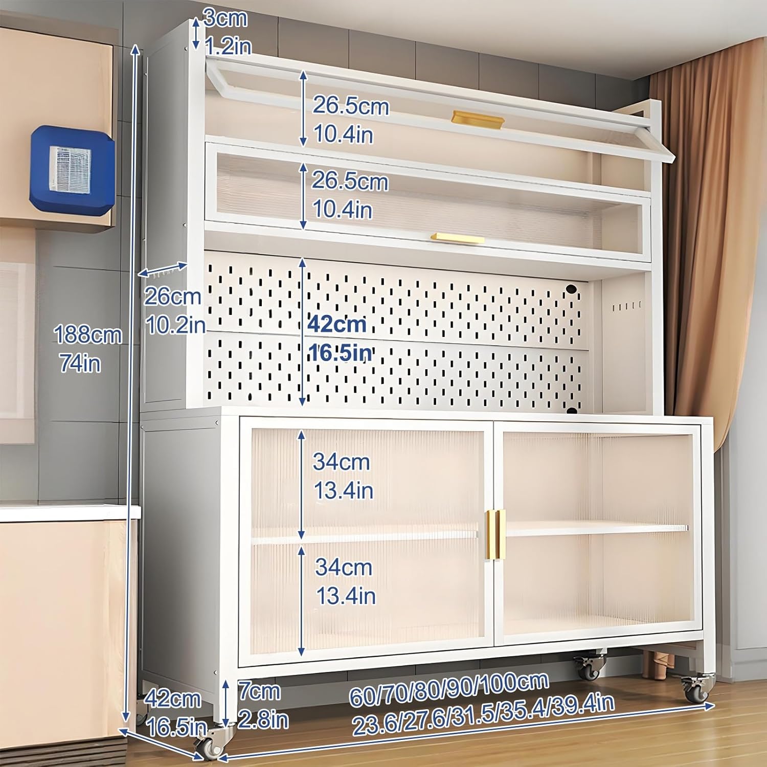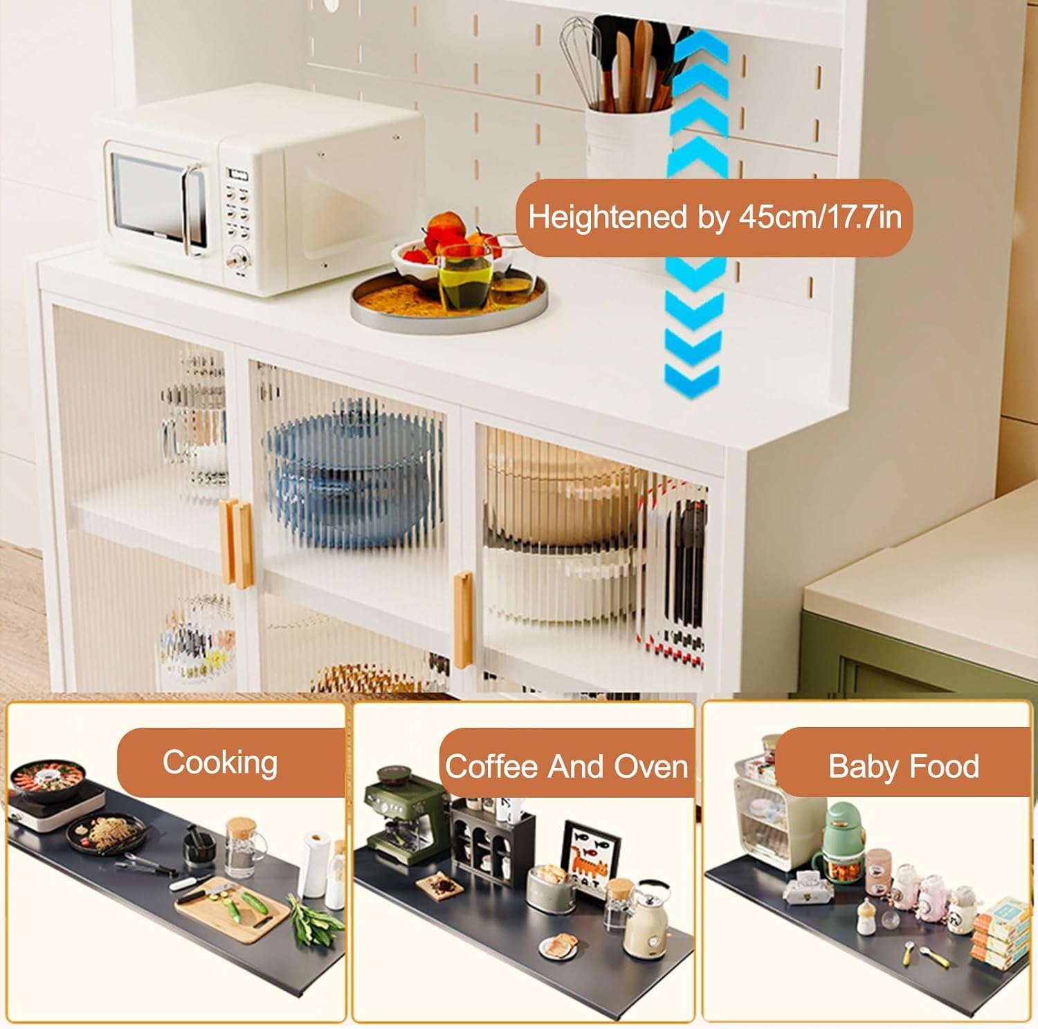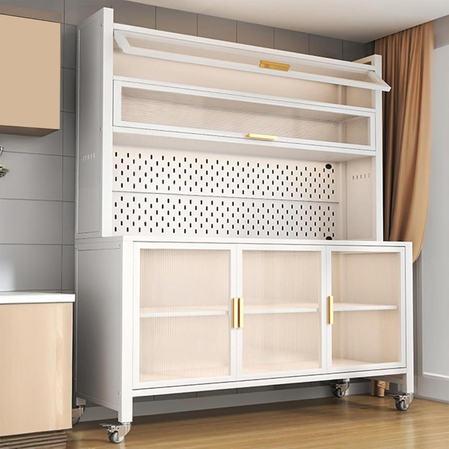 ———The Kitchen Pantry Cabinet features farmhouse-style design and thoughtful details, creating a relaxing, inviting, and inviting space.>>> The Kitchen Pantry Cabinet combines storage and functionality, storing tableware and small appliances. Its space-saving design meets diverse dining needs.>>> The Kitchen Pantry Cabinet's interior is strategically divided, allowing for easy categorization and storage of various items. This keeps the cabinet neat and organized, making access more convenient and efficient.>>> The shelves are adjustable in height to accommodate various storage needs. This allows for flexible storage space and enhanced convenience.>>> The Kitchen Pantry Cabinet is made of transparent acrylic, ensuring clear visibility of items. It's lightweight and shatterproof, combining aesthetics with practicality.>>> The extended countertop provides ample workspace, accommodating a variety of kitchen appliances for comfortable use.>>> The Kitchen Pantry Cabinet features a hollow back panel that can be used to connect an external power strip, keeping the countertop clean and beautiful.【Product Features】Product Name: Kitchen Pantry CabinetMaterial: MetalStyle: Contemporary and MinimalistDesign: Floor-standingNumber of Shelves: 6Opening: Lift-upPackage Contents: 1 Kitchen Pantry Cabinet