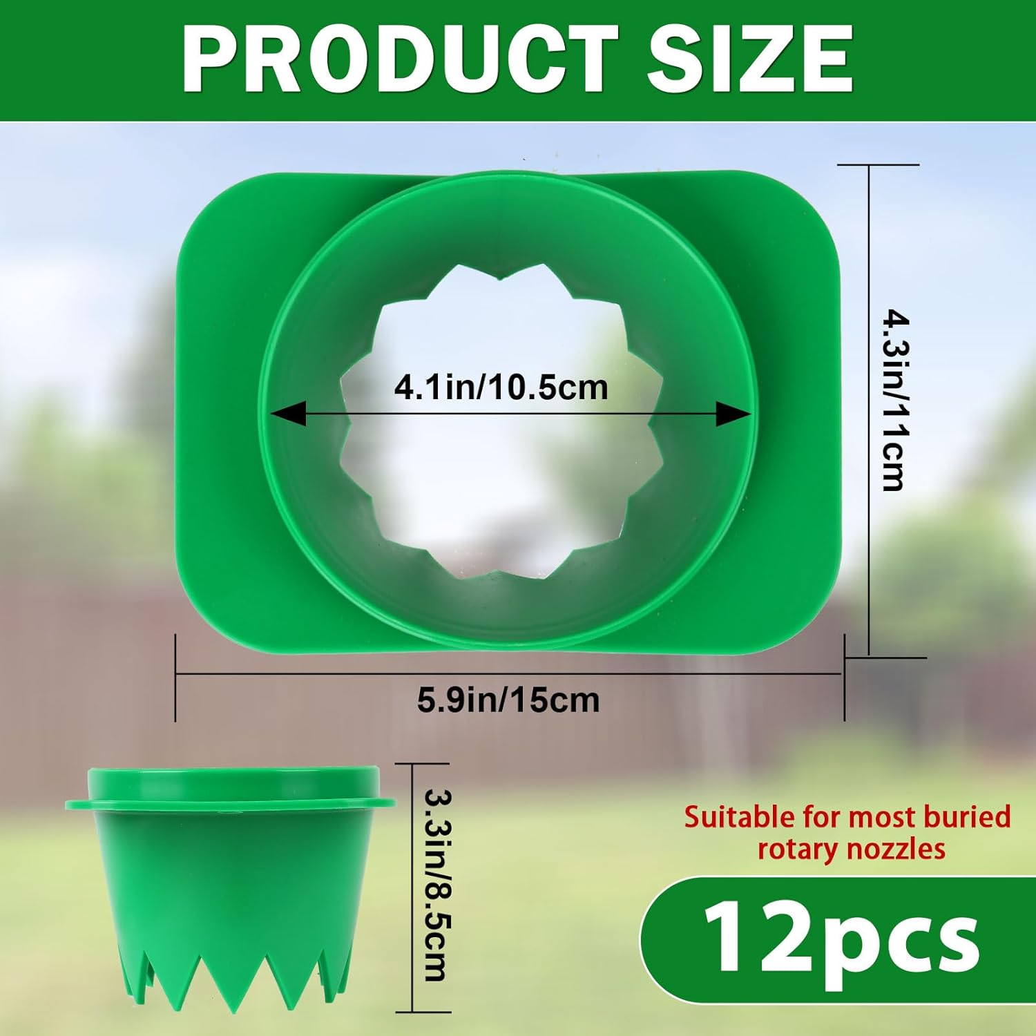 • Pack of 6/12 Sprinkler Donuts: Each sprinkler head protector measures 5.9Inch Rectangular Shaped Donut with 4.1 Inch Inner Diameter,Its lower portion is 3.3 inches high ,Green Outdoor Lawn Spray Guard