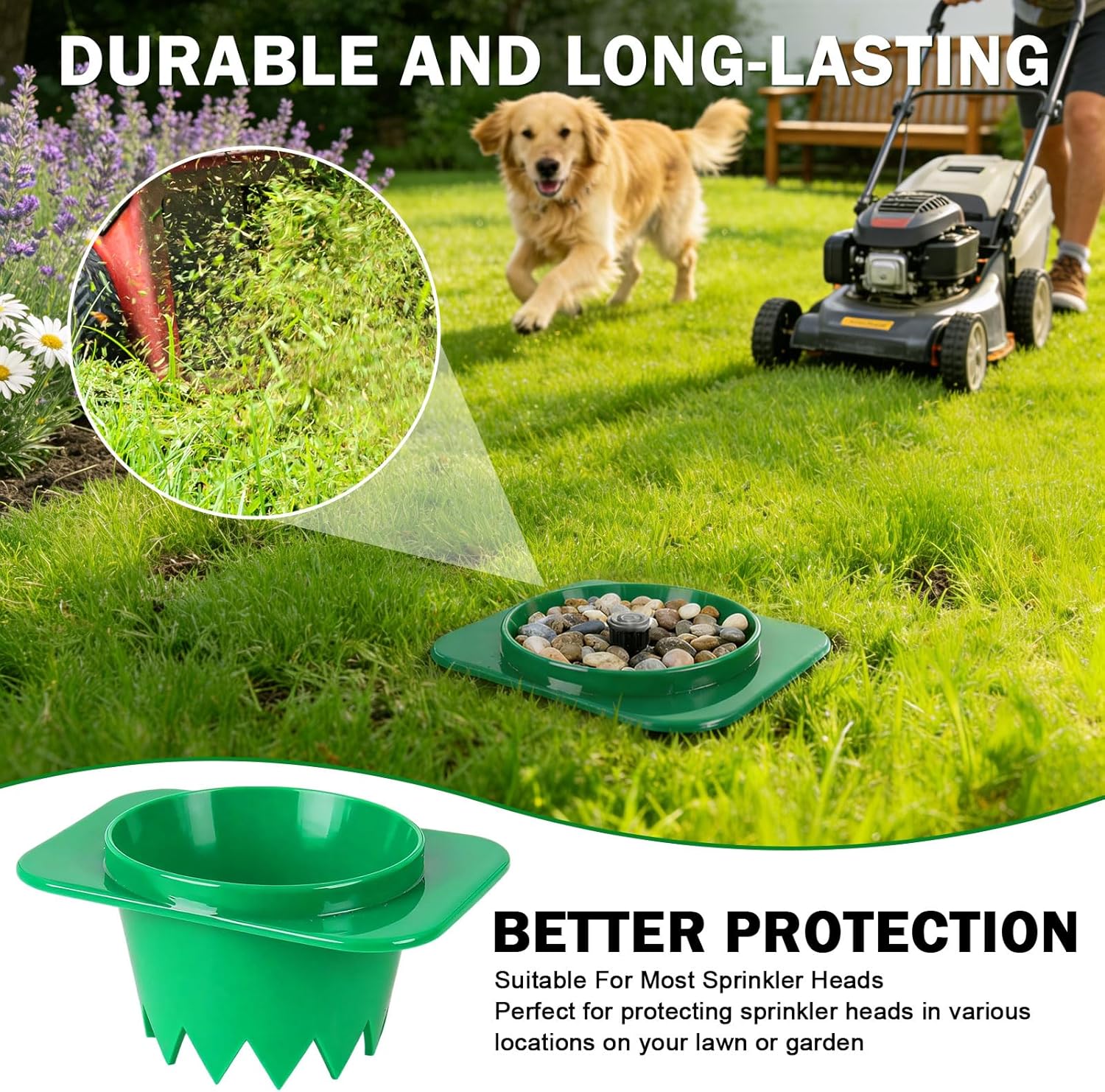• Sprinkler Head Protector: The Sprinkler head protector effectively prevents damage to the sprinkler head caused by collisions with lawnmowers, foot traffic, and other outdoor activities,It also suppresses excessive weed growth, ensuring that the spray range and distance remain unaffected