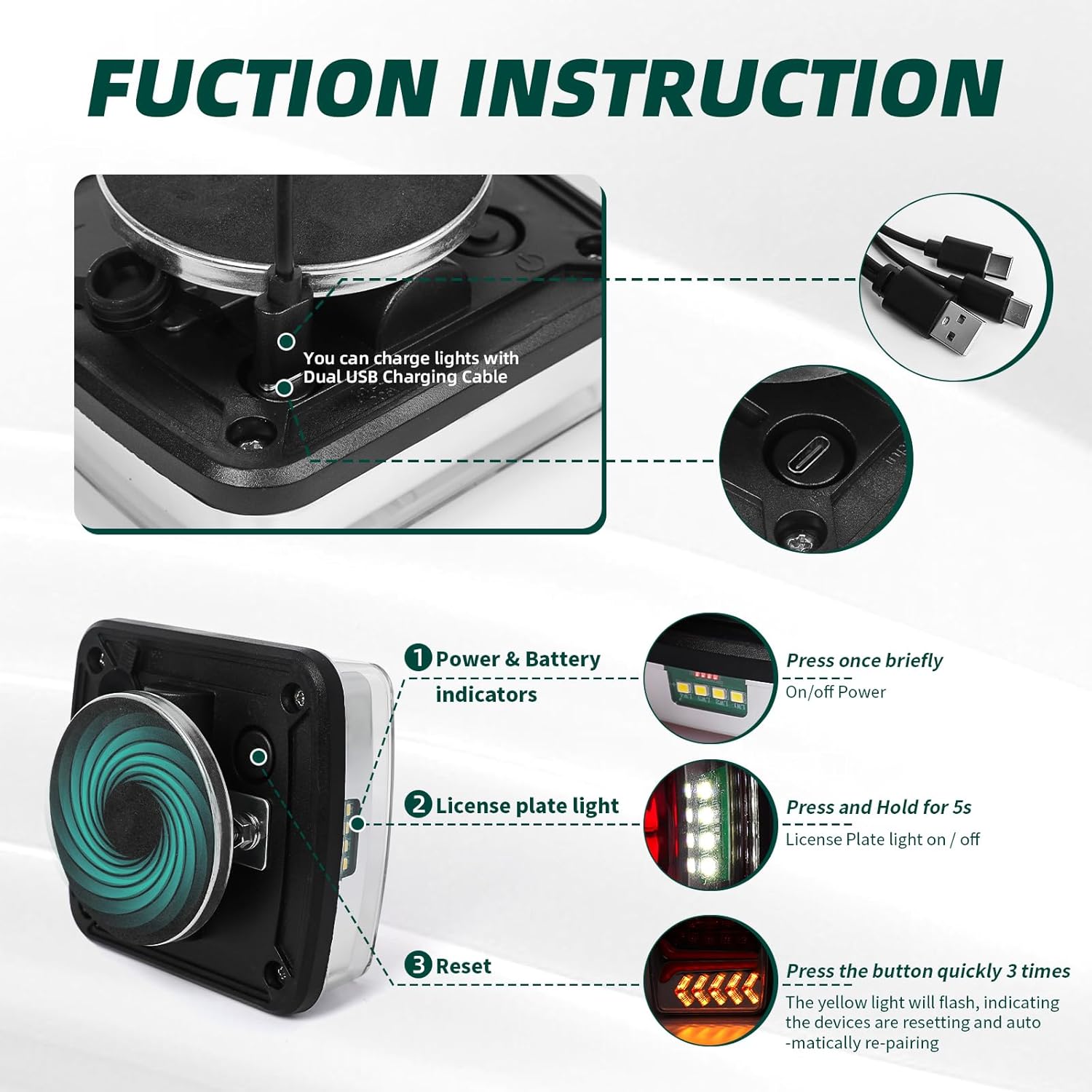 | Included Components | 1x car charger, 1x connector(transmitter), 1x usb android charging cable, Magnetic Wireless Trailer Lights |