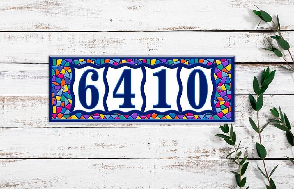 This beautiful hand-made ceramic tile house number plaque makes a great ornamental decoration for your home or cottage. Plaques are suitable for indoor and outdoor and include pre-drilled holes and two stainless steel screws for easy installation.