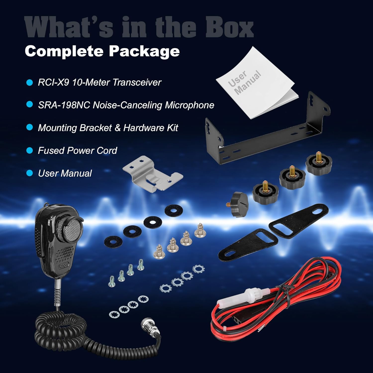 | BuiltIn Media | Fused Power Cord/User's Manual, Mounting Bracket & Heavy-Duty Hardware Kit, RCI-X9 10-Meter Transceiver, SRA-198NC Dynamic Noise Cancelling Mic |