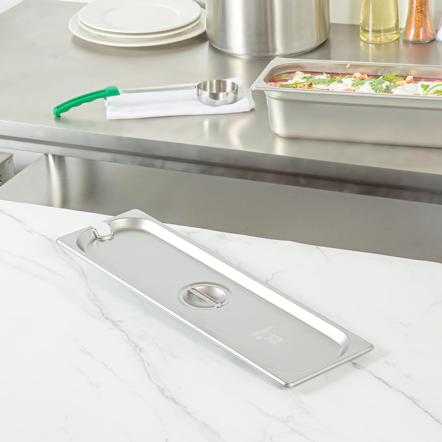 Enhance the appeal and protection of your foodservice with our Kitchen Tek Stainless Steel Slotted Lid. Pair this lid with our long steam table pans (SKU: RWT1607S, RWT1608S, RWT1609S) to keep food protected. Manufactured using 24-gauge stainless steel, this lid for hotel pan ensures durability and reliability for prolonged usage in professional kitchen environments. This pan lid is furnished with practical flat, center handle, facilitating swift and effortless access to your food items. The side slot design of this metal lid provides convenient storage space for serving utensils, ensuring quick retrieval when required. Aligning with NSF standards, this metal lid adheres to the requirements of the foodservice industry. This chafer cover snugly fits and effectively retains heat, ensuring that the food temperature is maintained at the optimal level. Designed to be freezable, this steam pan lid offers versatility in food storage and provides a convenient solution for storing your culinary creations. This catering pan lid is compatible with commercial dishwashers, making cleanup a breeze. The polished exterior of this buffet pan lid adds a touch of sophistication, enhancing the presentation of your dish. This stainless steel lid measures 20.8 inches in length by 6.4 inches in width. Sold in a 1 count box. Steam table pans are available and sold separately.