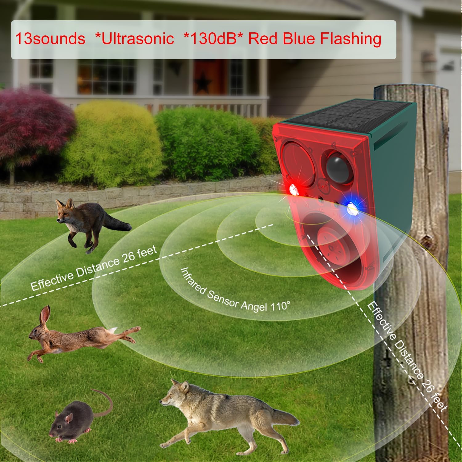 Features: 【Built-in 13 sounds】 Sensitive motion sensor are 13 kinds of music by default. 【Multiple operation modes for any situation】The motion detector alarm light has 4 modes of operation. 【Advanced solar power charging】 alarm motion detector will work non-stop while the solar power is charging, maintenance-free and easy to install. 【Easy Installation & Widely use】 Wall mount, making it easy to install. The motion sensor noise maker are widely used in warehouses, factory, school security, farm, orchard, villas, garden, yard and other need security alarm places. Specifications: Material: ABS Solar Panel: 5V 120mA monon silicon panel LED source: Blue + Red LED Charging method: Solar charging/DC 5V Battery: built-in 3.7V 1200mAh battery Charge time:Solar energy >8 hours; DC 5V >2hours(DC5V *1A) Working time: Motion sensor siren 15S > 100 times Alarm Volume: Alarm sound 129DB*2 channels, Low frequency 129DB,high frequency 12KHZ-44KHZ(Multi-segment) 3 level volume adjustable: 99db,125db,130db. with 13 built-in sounds: Dog Barking Gunshot/Wolf howl/Gong knocking sound/Eagle calls/Firecracker sound/Lion Roar/Pig Squeal sound/Explosion sound/Didi alarm sound/Car horn sound/Alarm sound/Bell sound/Whistle Siren sound (play in a loop) Record: Repeatable recording, max record 15 seconds per times Motion sensor distance/angle: 5-8M (affected by temperature) Waterproof grade: IP55 Installation: Wall mount Package Include: 1 x Solar infrared sensor alarm lamp 1 x usb cable 1 x Remote controller 1 x User Manual