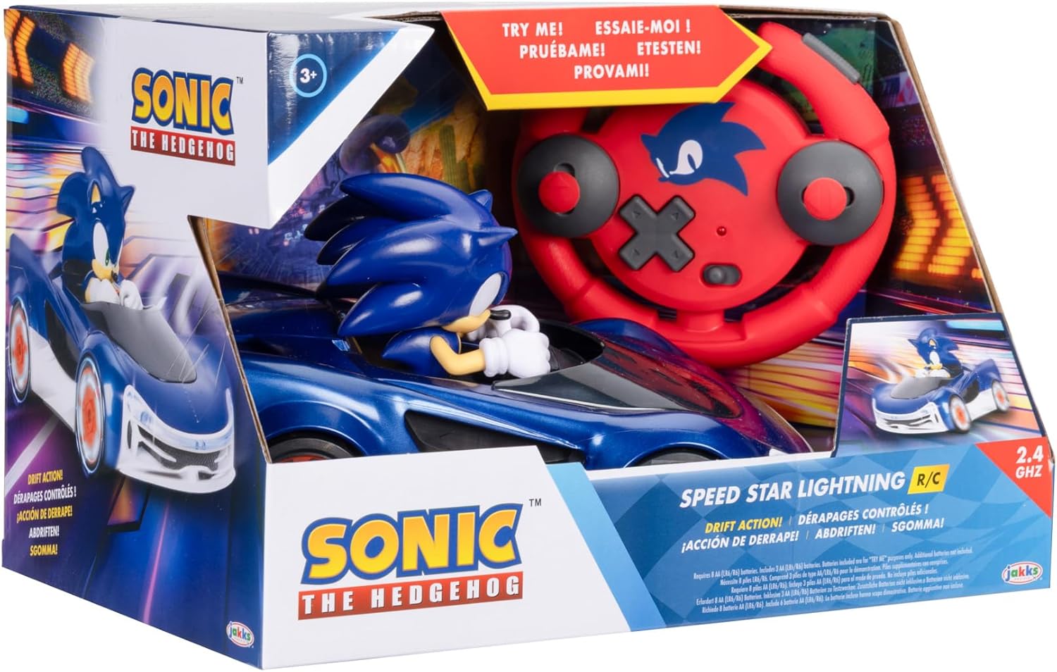Experience the speed of Sonic with this Sonic Drift RC vehicle, an ultra-stylized remote-controlled car that honors the world of the blue hedgehog. Featuring built-in lights and Sonic-designed bodywork, this vehicle allows kids to recreate wild races in their own living room. Thanks to an easy-to-use remote control, the toy is easy to steer, make fast turns and remains stable on different surfaces. The vehicle also includes a Sonic figure fixed to the wheel, and its light effects enhance immersion during the race. Perfect for stimulating hand-eye coordination and a taste for healthy competition, this toy is ideal for children aged 3 and up, whether they are fans of racing games or the Sonic universe. Officially licensed by SEGA, it guarantees quality workmanship that lives up to the expectations of fans of all ages. Whether it's for a birthday, Christmas or simply for racing with friends, this RC vehicle is a must-have in the Sonic universe. Let the track light up and get ready to race for victory!