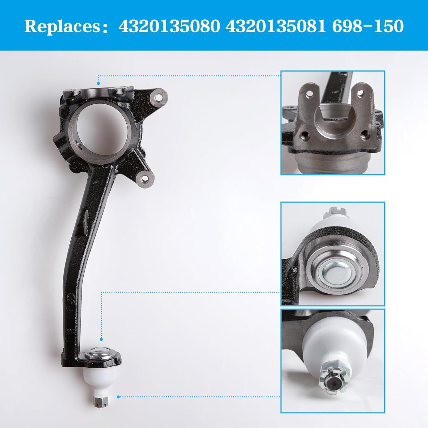 Product DescriptionFront Steering Knuckle Spindle Right Passenger SideApplicationCompatible With Toyota 4Runner Base,Limited,SR5 1996 1997 1998 1999 2000 2001 2002 2.7L 3.4L L4 V6Compatible With Toyota Sequoia Limited SR5 2001 2002 2003 2004 4.7L V8Compatible With Toyota Tacoma Base,DLX,Limited,Pre Runner,S-Runner,SR5 1995 1996 1997 1998 1999 2000 2001 2002 2003 2004 2.4L 2.7L 3.4L L4 V6Compatible With Toyota Tundra Base,Limited,SR5 2000 2001 2002 2003 3.4L 4.7L V6 V8Replaces Part Number:698-150,698150,43201-35080,4320135080,43201-35081,4320135081;(Part numbers are provided for cross-reference and fitment guidance only. Buyers should verify compatibility before purchase.)After-Sales SupportCovered by our 6-month support service for defects in material and workmanship under normal use. Contact us for replacement eligibility.